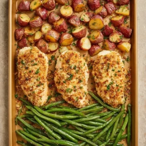 Imagine tender chicken breasts coated in a golden, crunchy Parmesan crust, perfectly roasted red potatoes, and vibrant green beans — all cooked together in harmony on a single sheet pan. With each bite, you’ll experience a delightful crunch followed by the juicy warmth of home. This is one you’ll definitely want to pin for later!